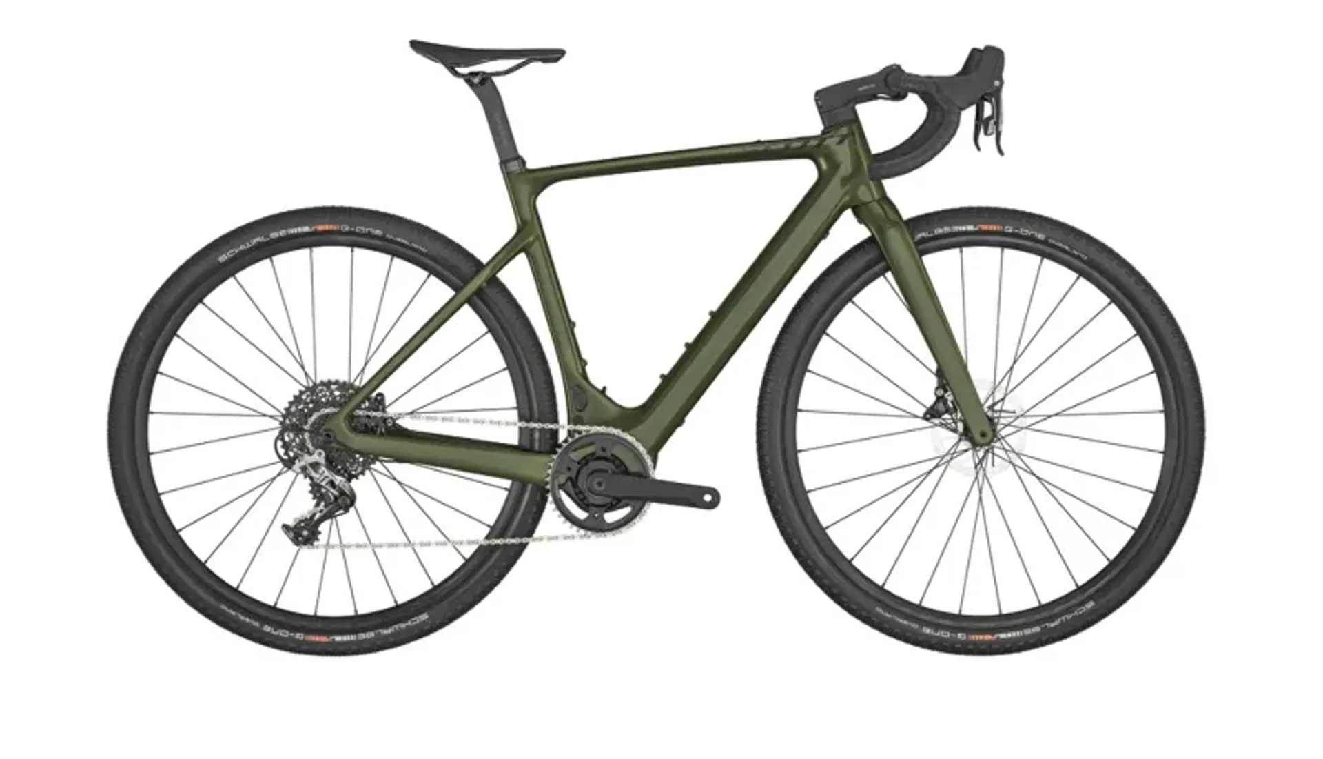 Solace eRIDE Disc HMX Carbon Frame: Utilising Scott’s premium HMX carbon fibre, the frame is engineered to be incredibly lightweight while maintaining the necessary compliance for gravel comfort and the stiffness for efficient power transfer. The internal battery integration maintains a clean, stealthy aesthetic.